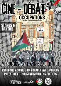 Le mercredi 22 avril à 18h30, la Projection est organisée par et suivie d'un échange avec Thousand Madleens Poitiers et le Comité Poitiers Palestine. Une projection soutenue par l'association CultureLL de l'Université de Poitiers.